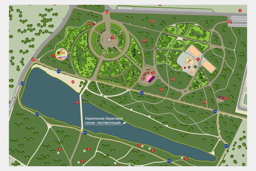 В парке организованы беговые и велосипедные маршруты, спортивные площадки для футбола, баскетбола, зоны для йоги и фитнеса.