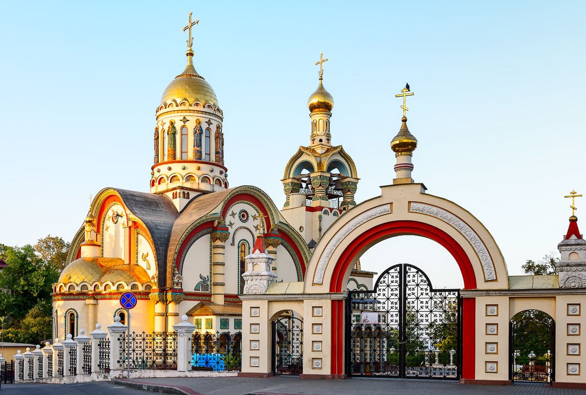 Собор выполнен в русском византийском стиле с элементами древнерусской архитектуры и барокко.